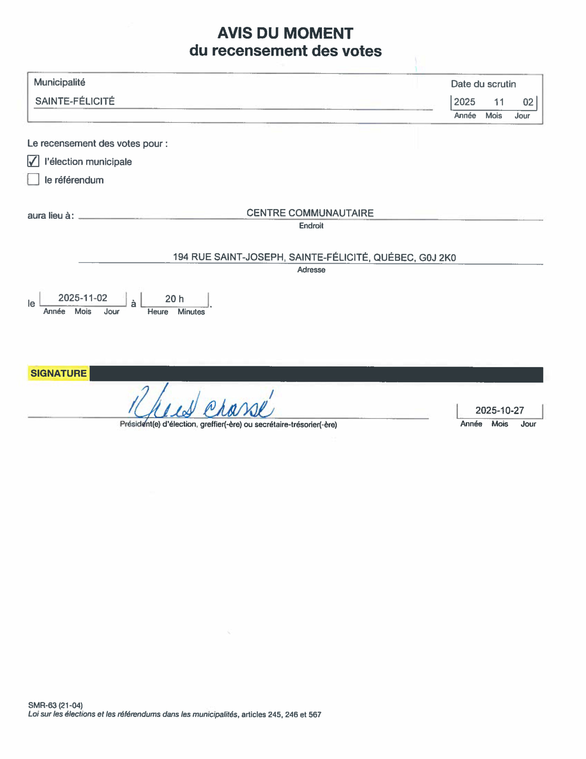 Proclamation d'élection des personnes candidates