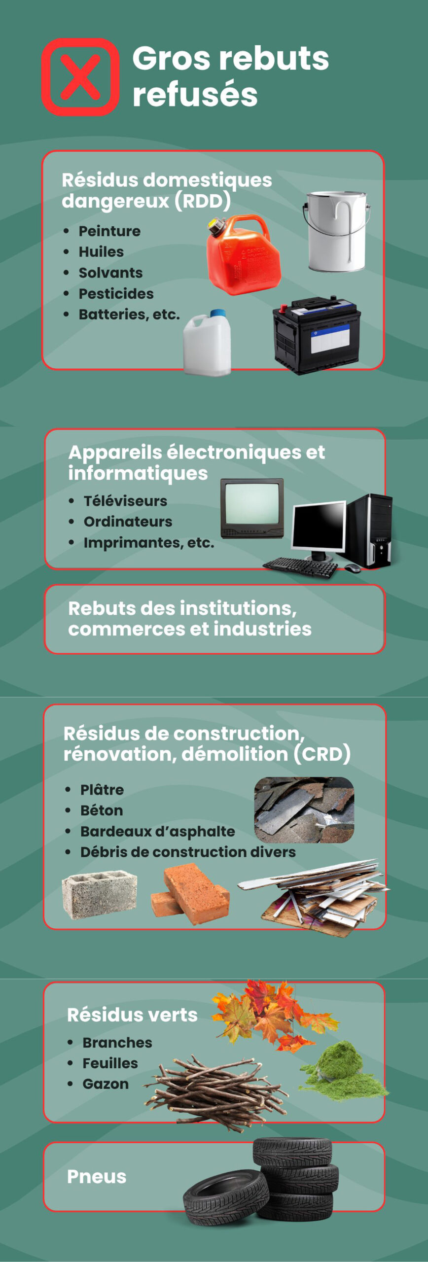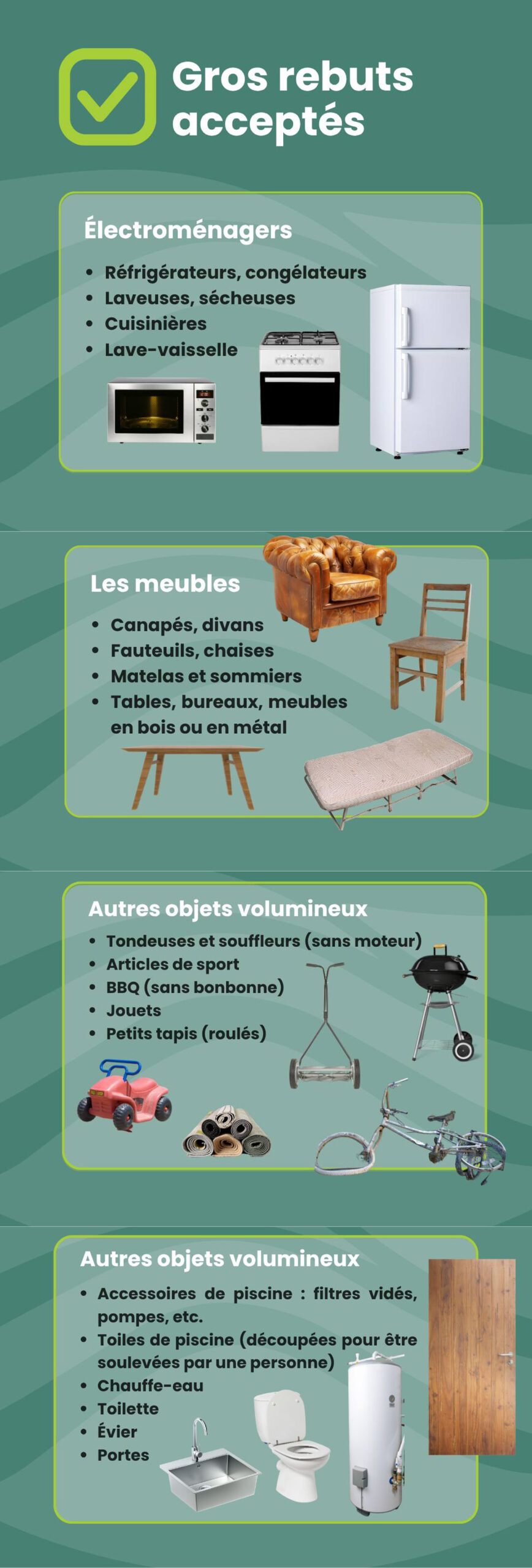 À Sainte-Félicité, la collecte d’encombrants sera le mardi 5 mai 2026. Les pneus, huiles, produits pétroliers, matériaux de construction, branches d’arbres non attachées ne seront pas acceptés. Merci de votre collaboration!
