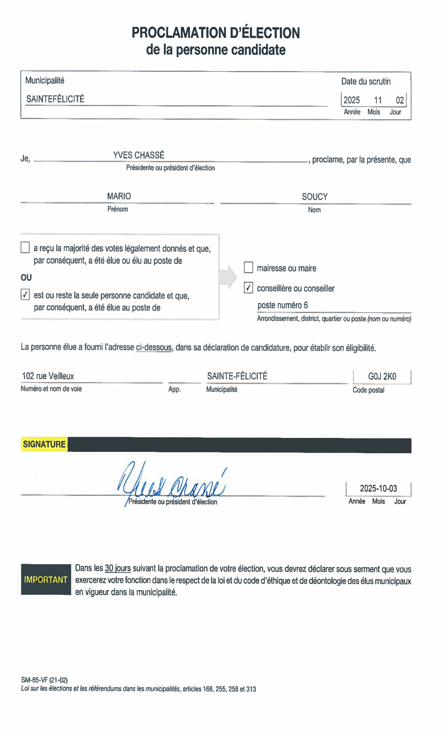 Proclamation d’élection de la personne candidate – Mario Soucy, poste de conseiller numéro 6 de la municipalité de Sainte-Félicité.