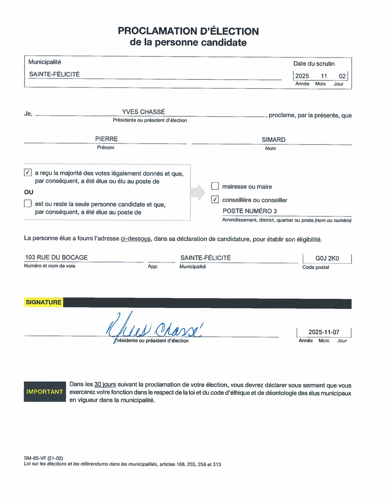 Proclamation d’élection de la personne candidate-Monsieur Pierre Simard
