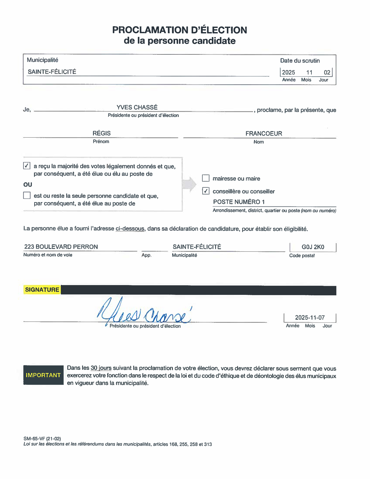 Proclamation d’élection de la personne candidate-Monsieur Régis Francoeur