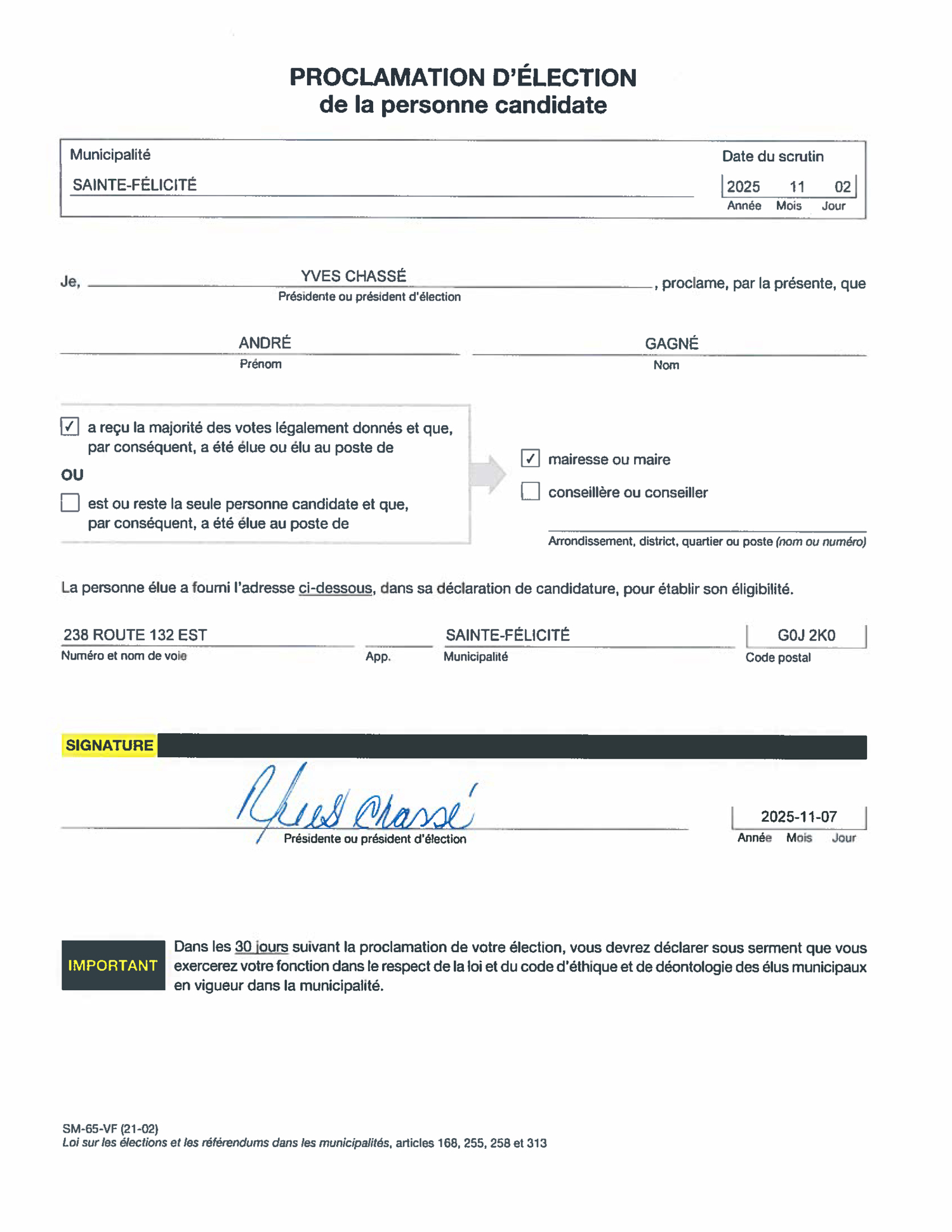 Proclamation d’élection de la personne candidate-Monsieur André Gagné